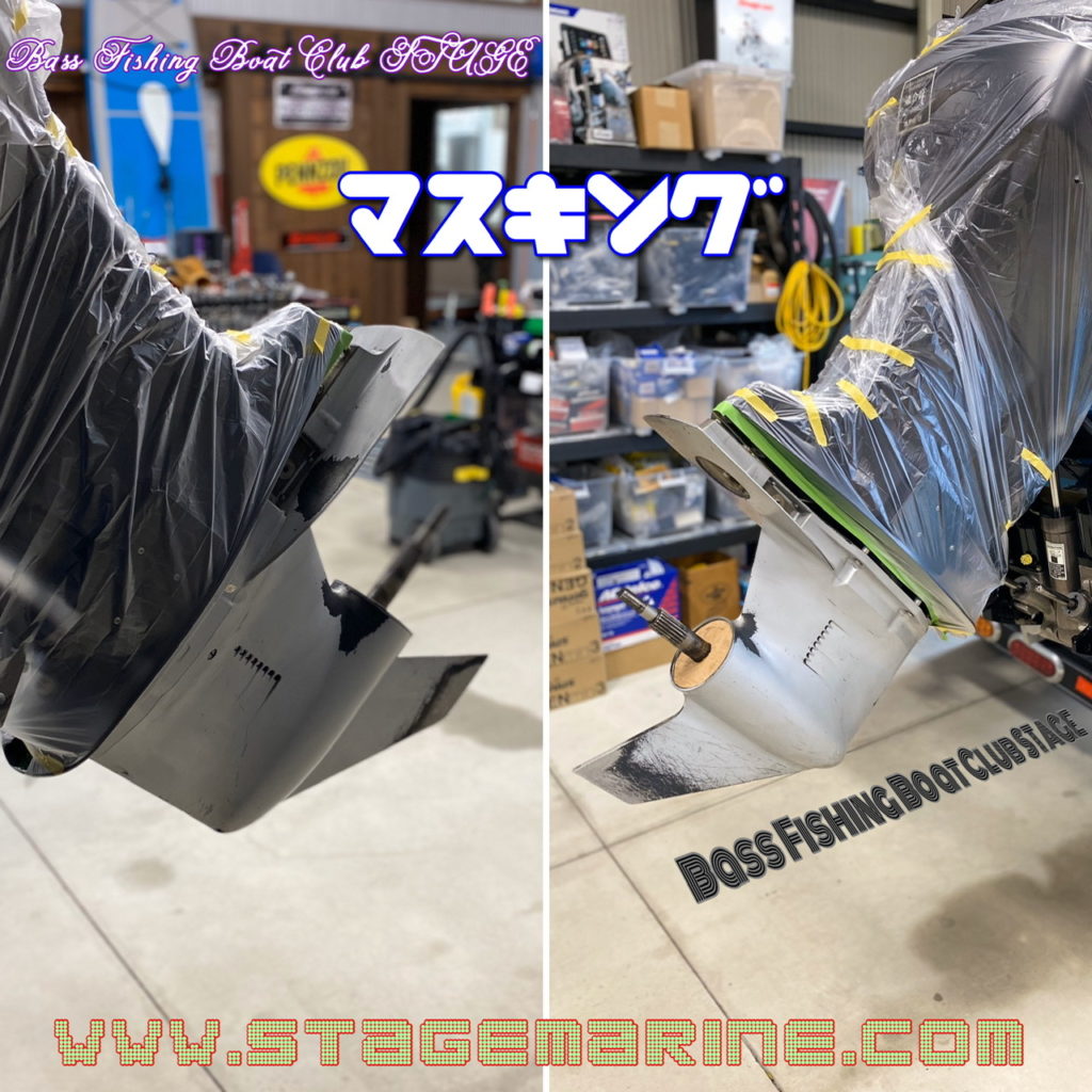 塗装前にエンジンカウリングへの塗料飛散防止の為の養生を行いますが建築資材で販売されているこのマスキングテープが便利でその他の船外機修理やメンテナンス作業、ボートの上で行う修理作業等にも多用しています。